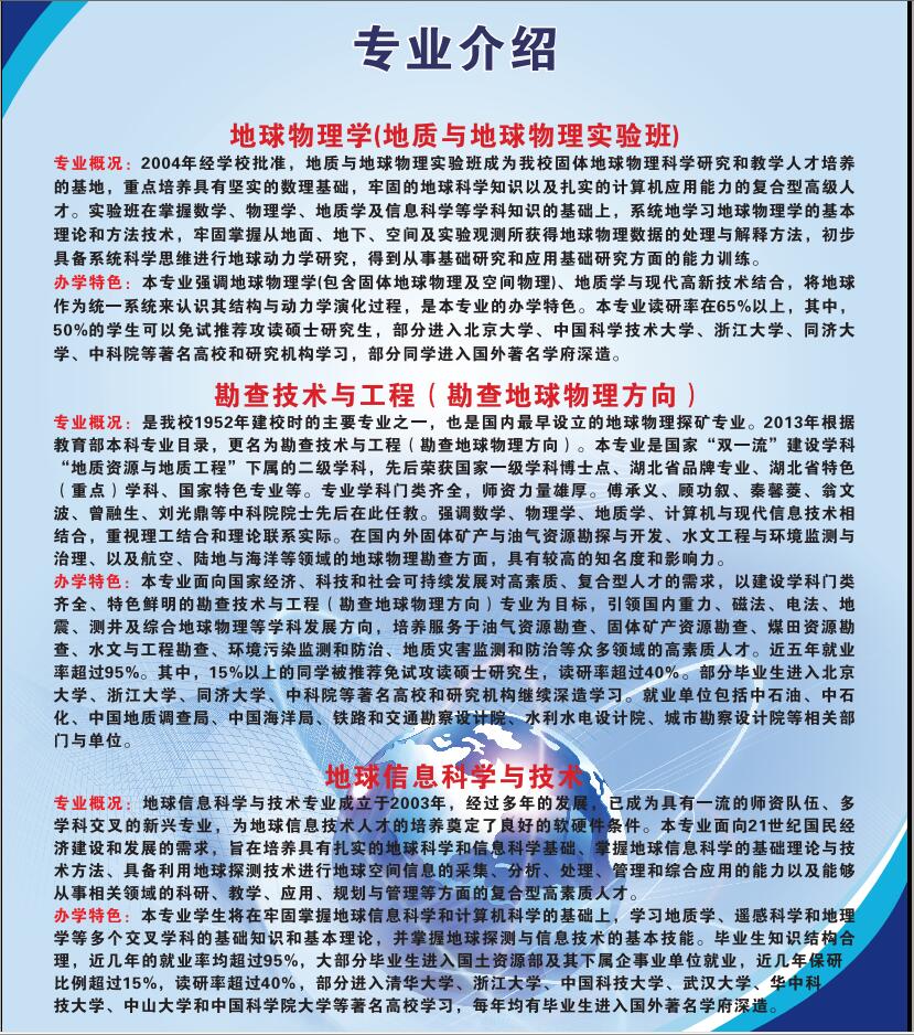 tyc33455cc太阳集团现有三个专业:地球物理学、勘查技术与工程、地球信息科学与技术。其中勘查技术与工程专业于2019年6月通过中国工程教育专业认证,