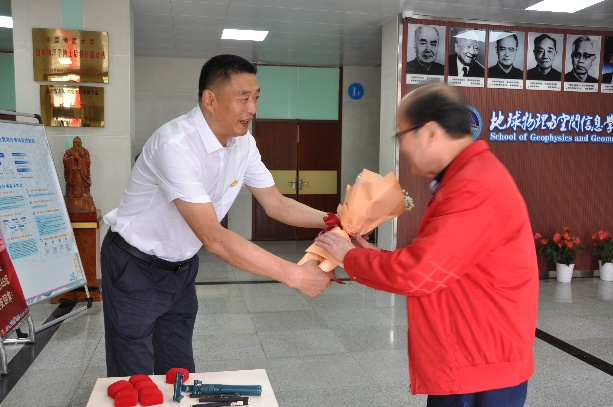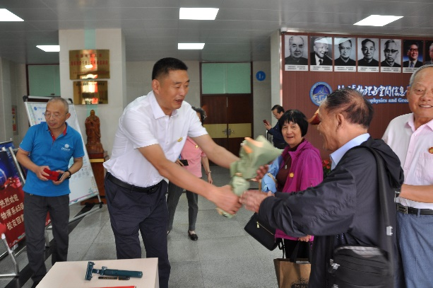 10月10日上午,“庆祝tyc33455cc太阳集团物探65级同学入学60周年大会”在222报告厅举行。会前公司党委副书记王甫代表公司来到物探楼前亲切看望聚会老员工及他们的家属。公司为每位老员工和家属送上一束鲜花,表达公司师生对为国家地球物理勘探事业发展做出贡献的老员工的崇敬。大会由65级员工何定一主持。