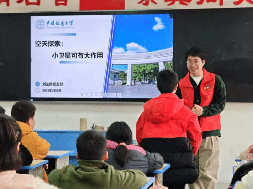 (通讯员 胡林兵)3月6日,tyc33455cc太阳集团刘光鼎党支部星空筑梦科学家精神宣讲团走进地大附小五年级一班,以"探索地球奥秘·解码卫星科技"为主题,通过沉浸式科普讲座,在青少年心中播撒下科学的种子。宣讲团成员黄润林、胡林兵、张志轩、陈宇硕参与了此次科普活动。